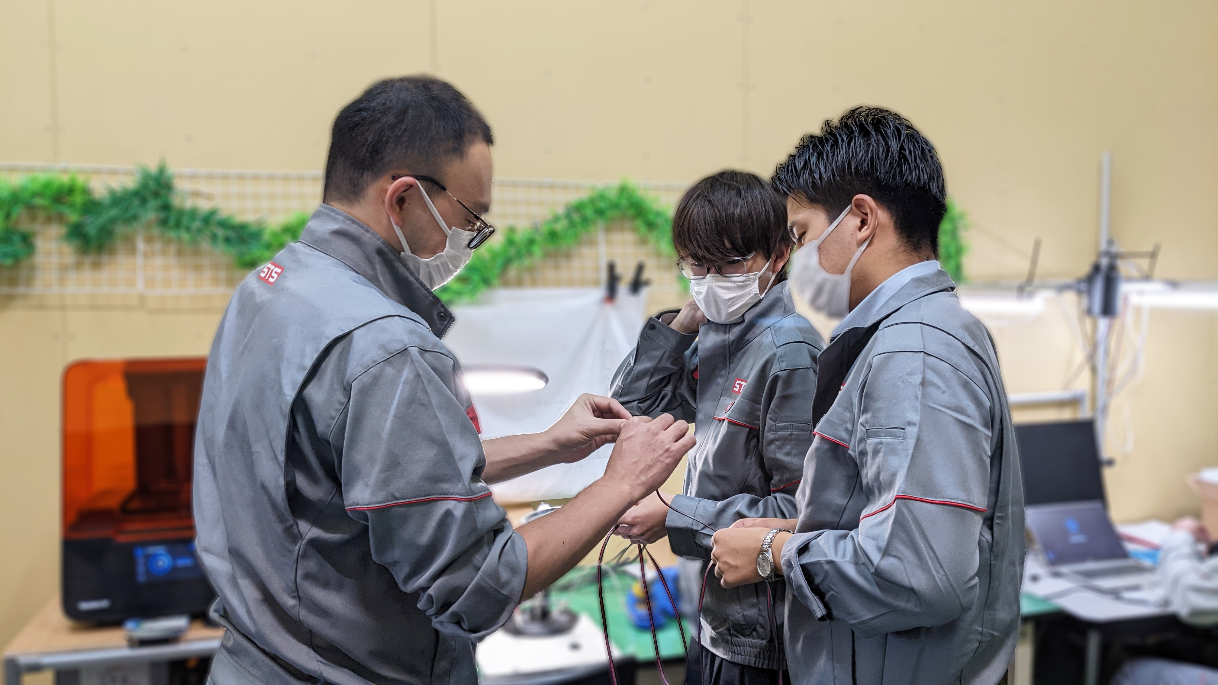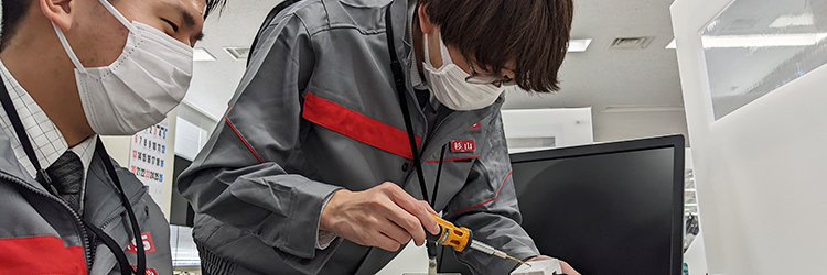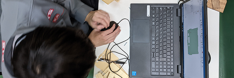 最終形をイメージして、3D CADを使い外装設計。これまで操作したことがないCADに初めは不安そうだったが、実習生が優秀で使い始めると時間を忘れるくらい没頭して作業を進めます。